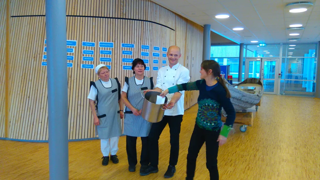 Vuorbbi geassime Árrangáddi kantiinna bargit Risten Gáren Hætta Skum, Risten Ánne Hætta, Jan Magne Hestvik ja Sámi allaskuvlla rektor Gunvor Guttorm. (govven: Kaisa Rautio Helander)